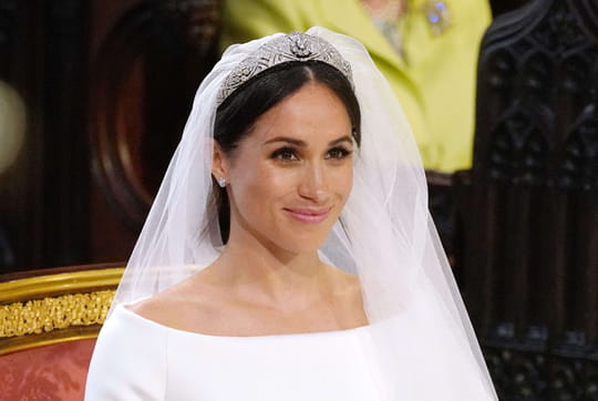 Pour mettre en valeur sa robe blanche à l'encolure bateau, l'Américaine de 36 ans a dévoilé une coiffure attachée. Sa chevelure a d'abord été lissée puis séparée en une raie au milieu. Ses longueurs ont été ramenées en un chignon bas légèrement volumineux. Pour la touche romantique, quelques mèches encadraient son joli visage. Sans oublier le sublime diadème en diamants, prêté par la Reine.