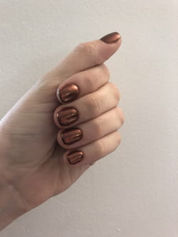 Le chrome se présente dans un pot, contenant des milliers de paillettes en poudre. A l'aide d'un embout mousse, la technicienne frotte la matière sur mon ongle vernis. Instantanément, l'ongle auparavant coloré de noir prend la couleur du chrome. J'ai choisi la couleur chrome Great Copper Tunity,un cuivré orange. Les pigments s'accrochent vite, même s'il reste certains endroits où les paillettes prennent moins. La technicienne remet du gel protecteur pour combler les manques. L'excédent de poudre qui s'est déposé autour de mes ongles est ensuite retiré grâce à un pinceau>.