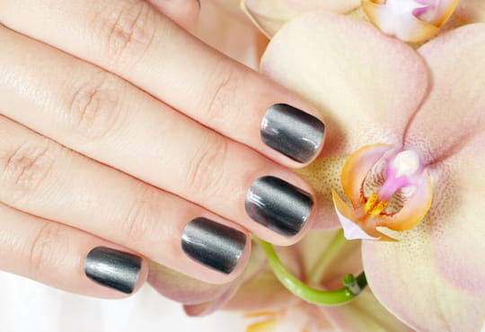 Tout commence par la préparation de mes ongles. Les étapes du limage, du soin des cuticules et du coupage des peaux mortes sont bien sûr respectées. Une fois mes ongles purifiés et bien propres, la prestation débute avec la pose d'une base et d'un vernis d'une couleur de mon choix : le noir (une valeur sûre). La technicienne applique trois couches successives qu'elle prend bien soin de fixer à chaque fois, grâce à un passage sous la lampe UV. Ensuite elle dépose un gel protecteur pour fixer les pigments métallisés.