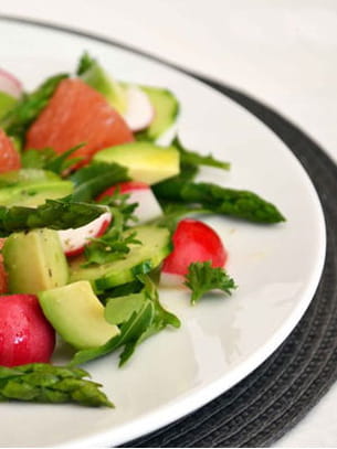 Salade d'asperges, radis et avocat au pamplemousse rose, vinaigrette à l'orange