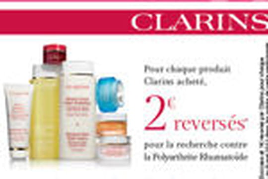 Du 25 avril au 8 mai prochain, pour tout produit corps Clarins vendu, 2 euros seront reversés à la fondation Arthiritis. Par le biais de cette opération, l'association souhaite encourager les femmes malades à s'occuper d'elles, à se réconcilier avec leur corps et transformer leur image de soi pour se donner les moyens de combattre leur maladie.