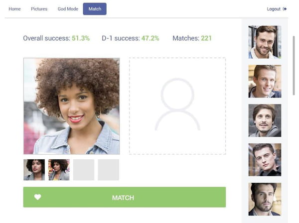 Une fois 20 prétendants sélectionnés par le robot, c'est là que l'humain (moi, du coup, pour l'expérience) entre en scène. Je vois donc, sur l'écran d'Amélie, la matchmakeuse, votre photo à gauche (vous êtes belle) et les photos de vos potentiels prétendants à droite (il y a de tout, sans vouloir vous spoiler). À moi de jouer et de dénicher votre âme sœur.