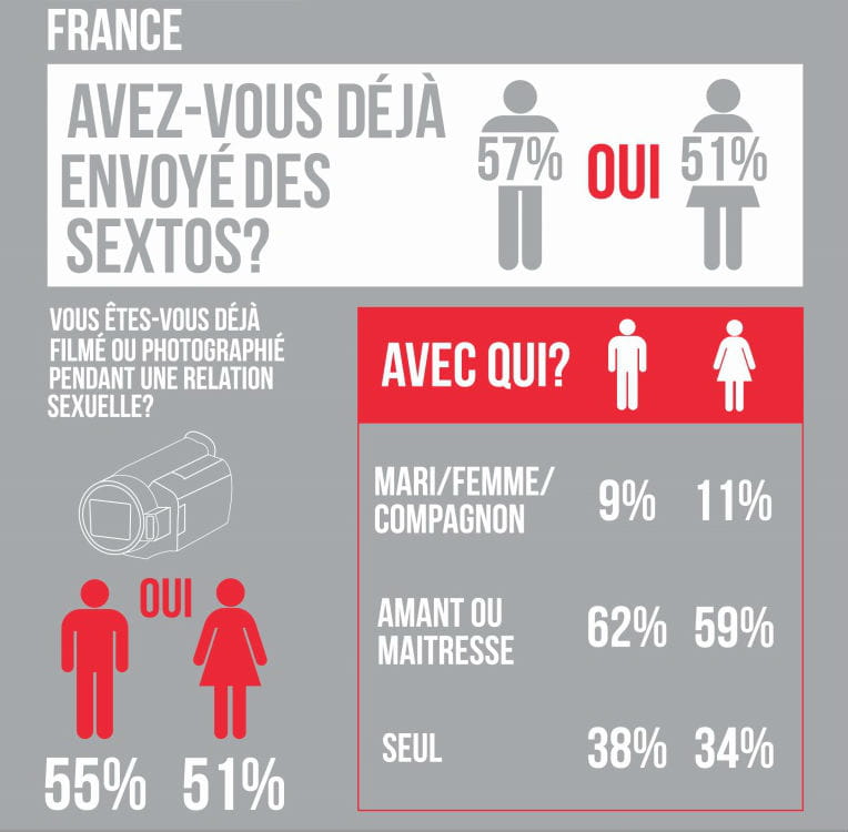 À la question "Vous êtes-vous déjà filmé ou photographié pendant une relation sexuelle ?", 55% des hommes ont également répondu par l'affirmative, contre 51% des femmes. Les personnes ayant déjà effectué cette pratique l'ont majoritairement fait avec leur amant ou leur maîtresse.