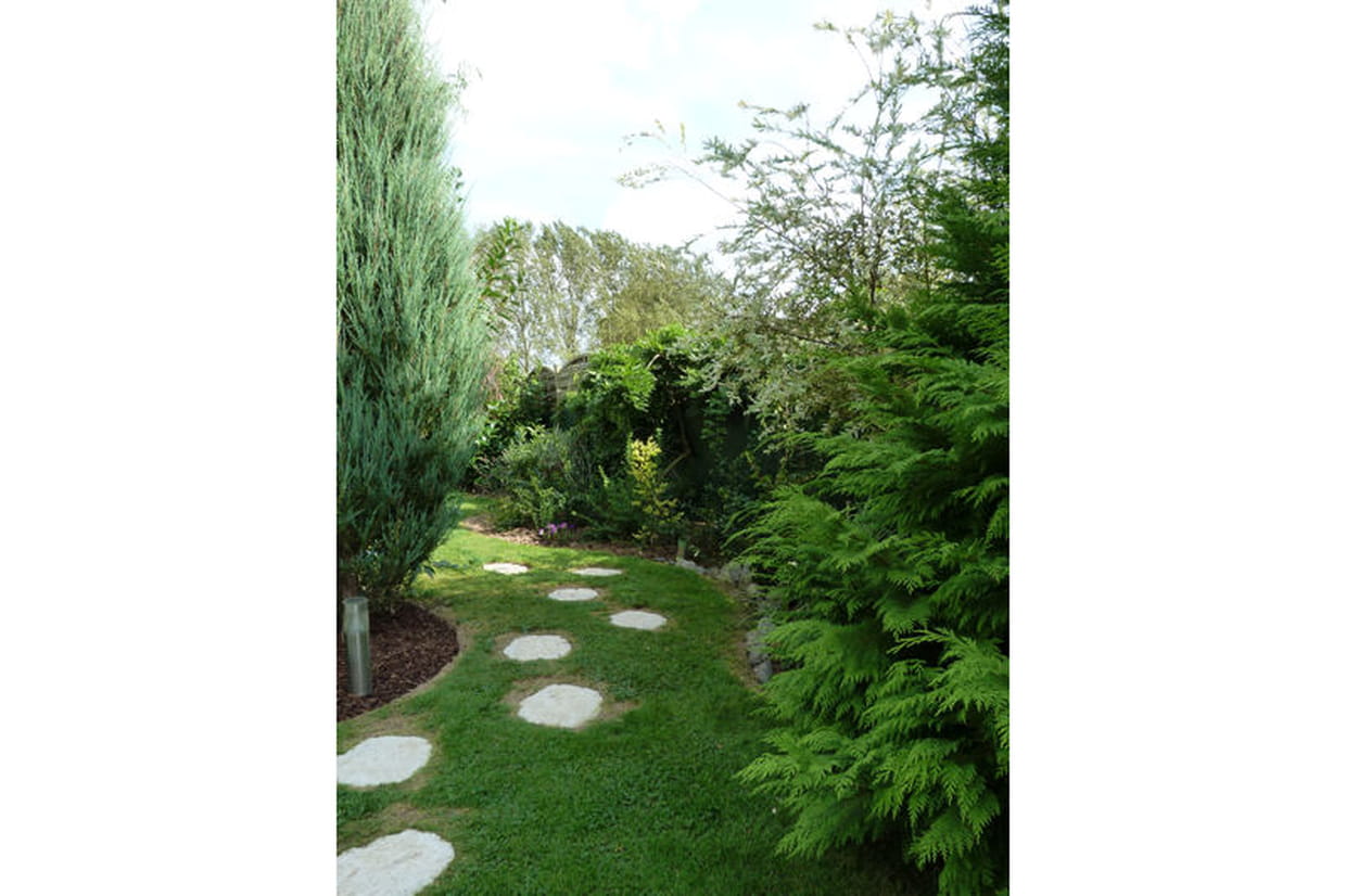 Tel un chemin mystérieux, cette allée de gazon et de pas japonais mène le visiteur de la terrasse au potager du jardin.