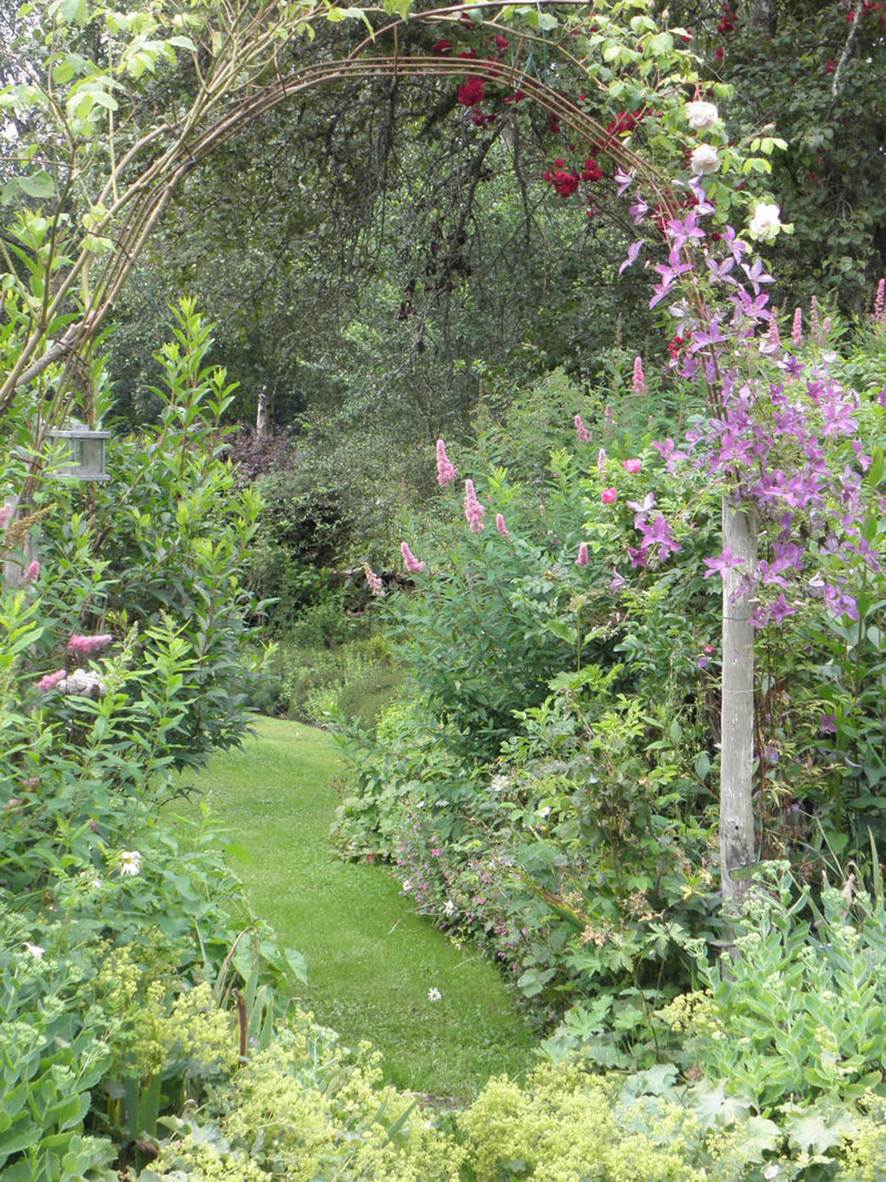 Au cœur de ce jardin abondant, l'allée, sinueuse et soignée, et son arche en fleurs sont une invitation à se promener, main dans la main. Pour les amoureux (de la nature).