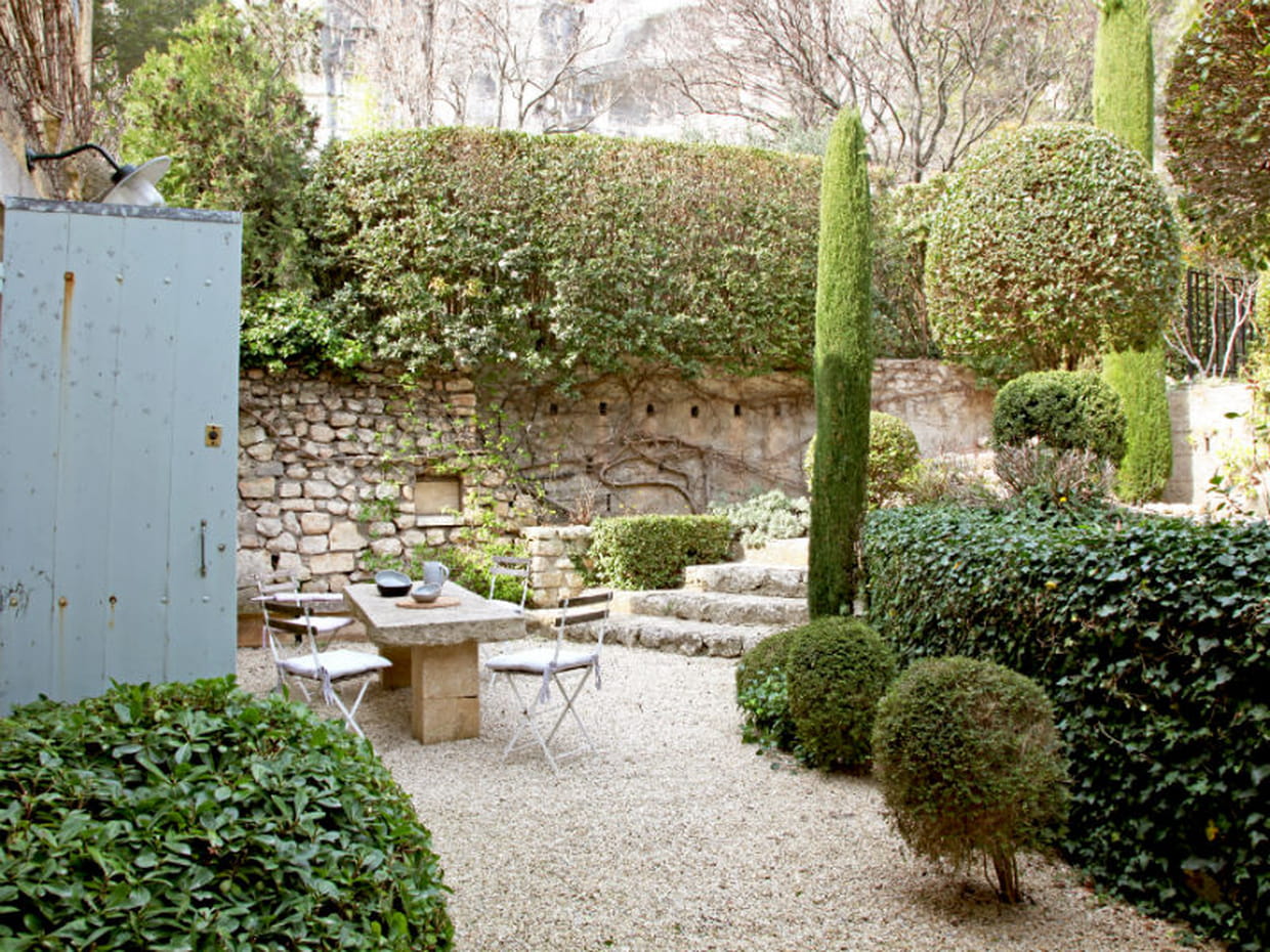 Bordée de topiaires, cette allée de graviers mène jusqu'à la salle à manger d'été. La taille des arbres et massifs confère à ce jardin, où la pierre domine, une touche d'élégance typiquement française. Voir le reportage