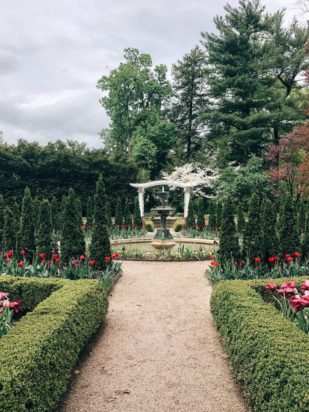 Une allée de jardin bordée de haies basses vers la fontaine