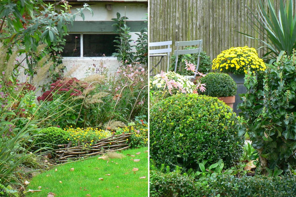 Sandrine a bien aménagé son jardin à l'aide de sedum, chrysanthèmes, buis et graminées. Quelques boules végétales, et hop le tour est joué !