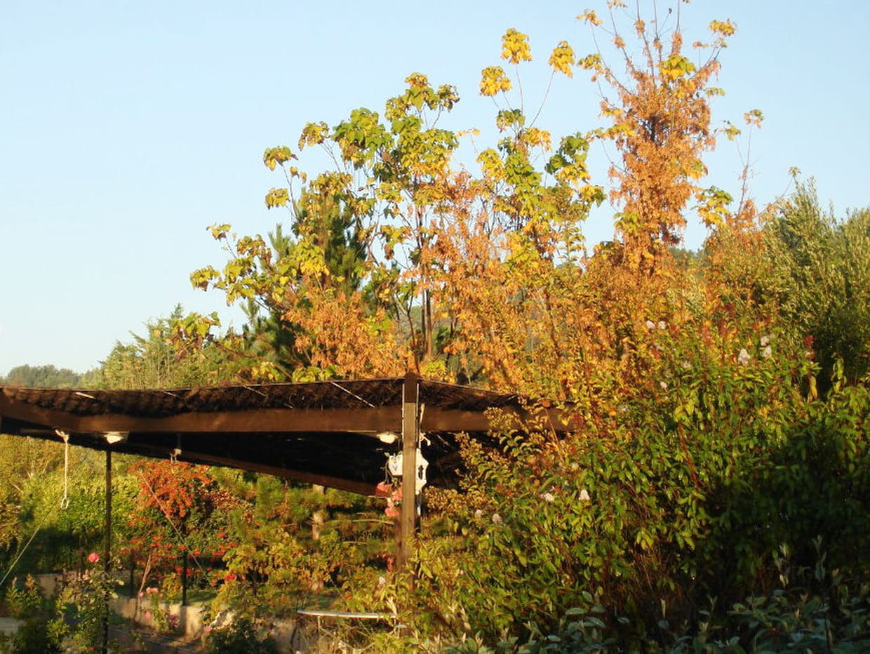 Dans le jardin de Nadine, la pergola est bien entourée. Dans la lumière du matin, la végétation qui l'entoure lui offre un bel écrin vert et doré.