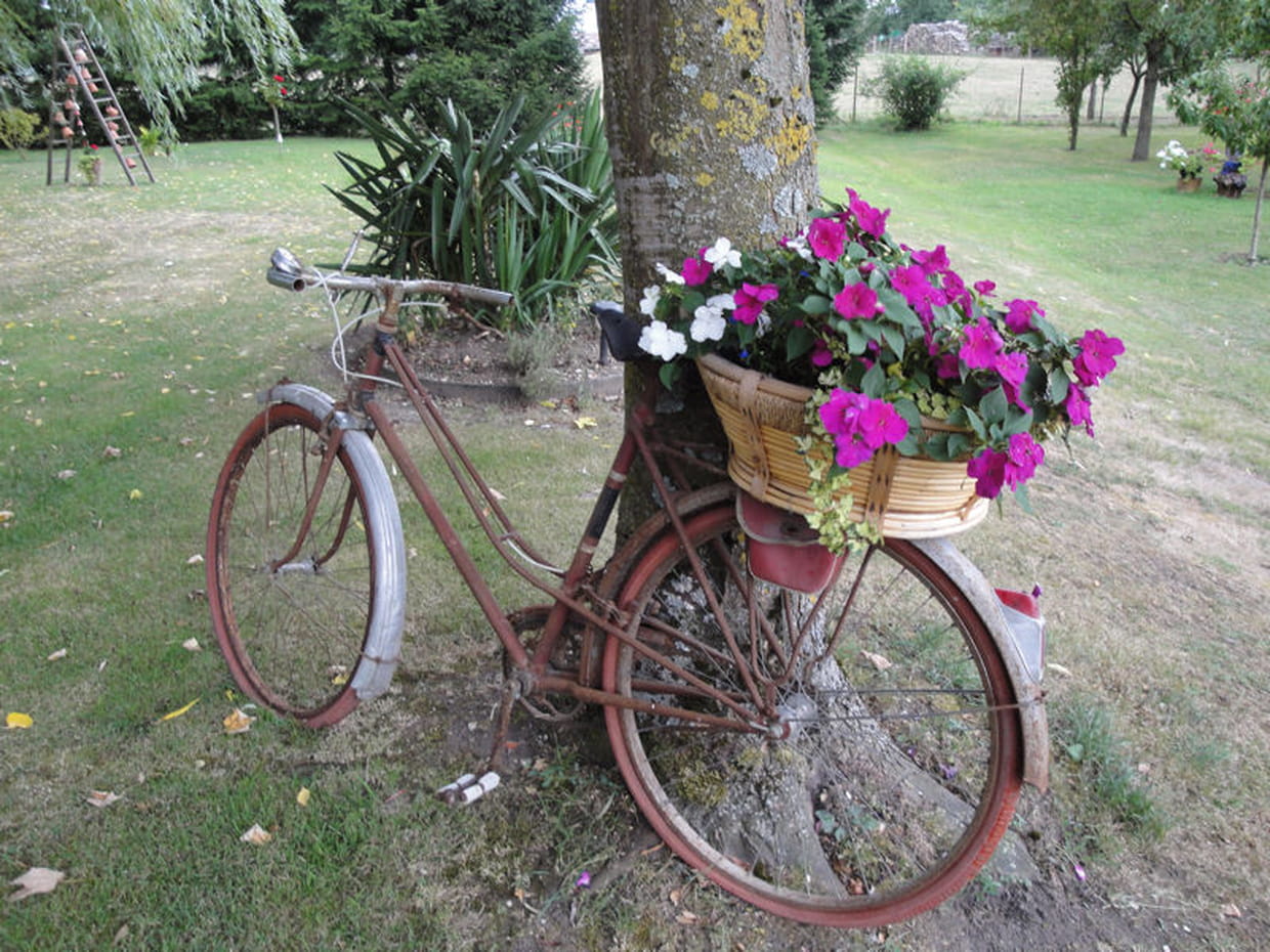 Dans son jardin, Nicole a installé une bicyclette vintage dans laquelle elle fait pousser quelques belles impatiens qui fleurissent encore en automne.