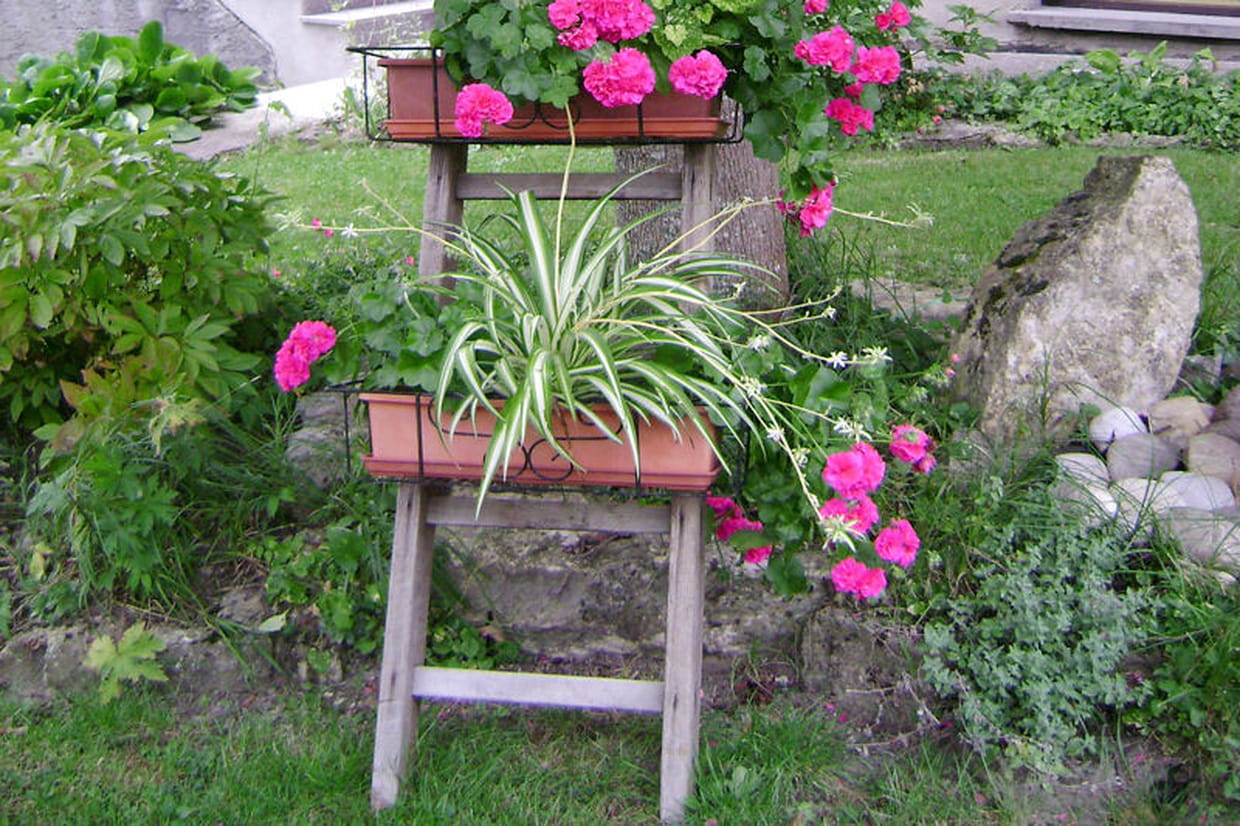 Vous ne savez pas quoi faire de votre vieille échelle et l'utiliser est devenu trop risqué ? Dans ce cas là, servez vous de ses rampes comme supports à vos bacs de géraniums. Simple à installer, l'échelle quant à elle peut être adossée à n'importe quelle surface. Ayez tout de même une petite préférence pour les échelles en bois qui s'installeront beaucoup plus discrètement au milieu de la nature.