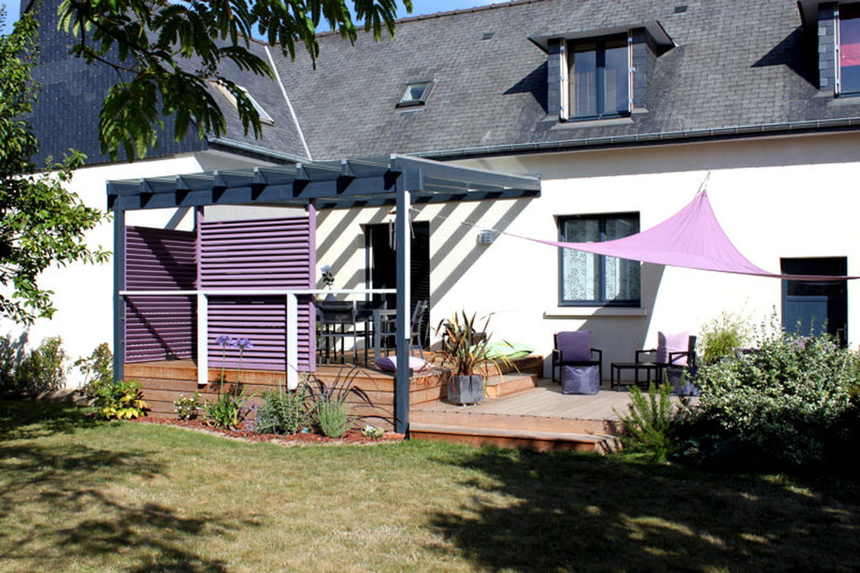 Toute en bois, cette pergola est également recouverte d'une plaque de verre. Avec ses volets coulissants de couleur mauve, il est facile de contrôler l'arrivée des rayons de soleil. Le verre, quant à lui, permet de fermer la pergola sans pour autant assombrir la terrasse. Un bac contenant un acer a été placé en-dessous. D'autres bacs permettent de déplacer les plantes selon l'envie du jour.