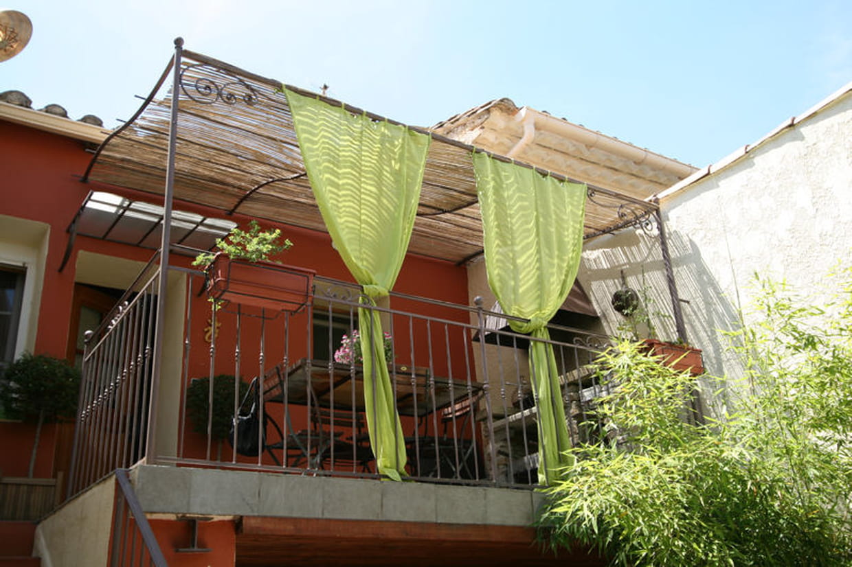 Cette maison colorée se situe dans un petit village non loin de Nîmes. Complètement retapée, elle offre maintenant un grand choix de possibilités. Au départ simple balcon, cet endroit est devenu une large terrasse aménagée. Dominant le patio, elle est entourée de fer forgé, et également habillée de canisses et de voiles vert pomme pour un rendu très estival.