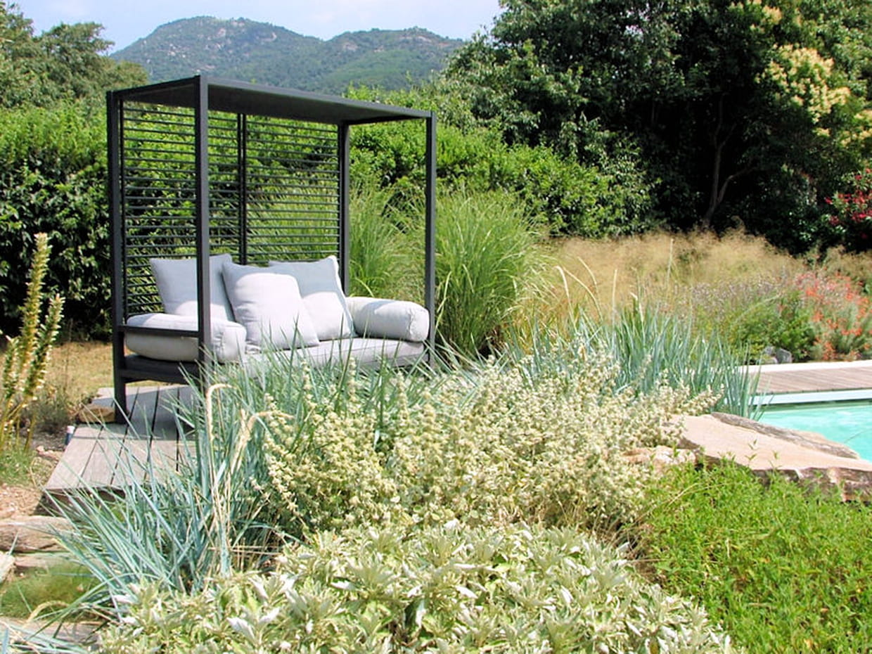 Composé d'une élégante banquette à baldaquin, le coin détente a pris place au milieu de cette végétation luxuriante.