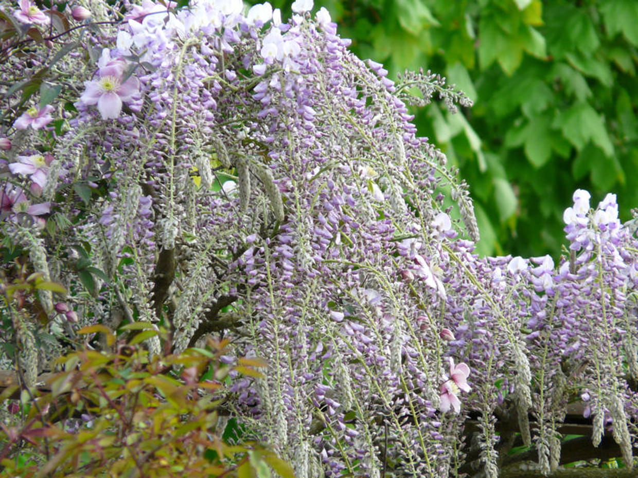 Dans le fond du jardin, une belle glycine s'épanouit largement.