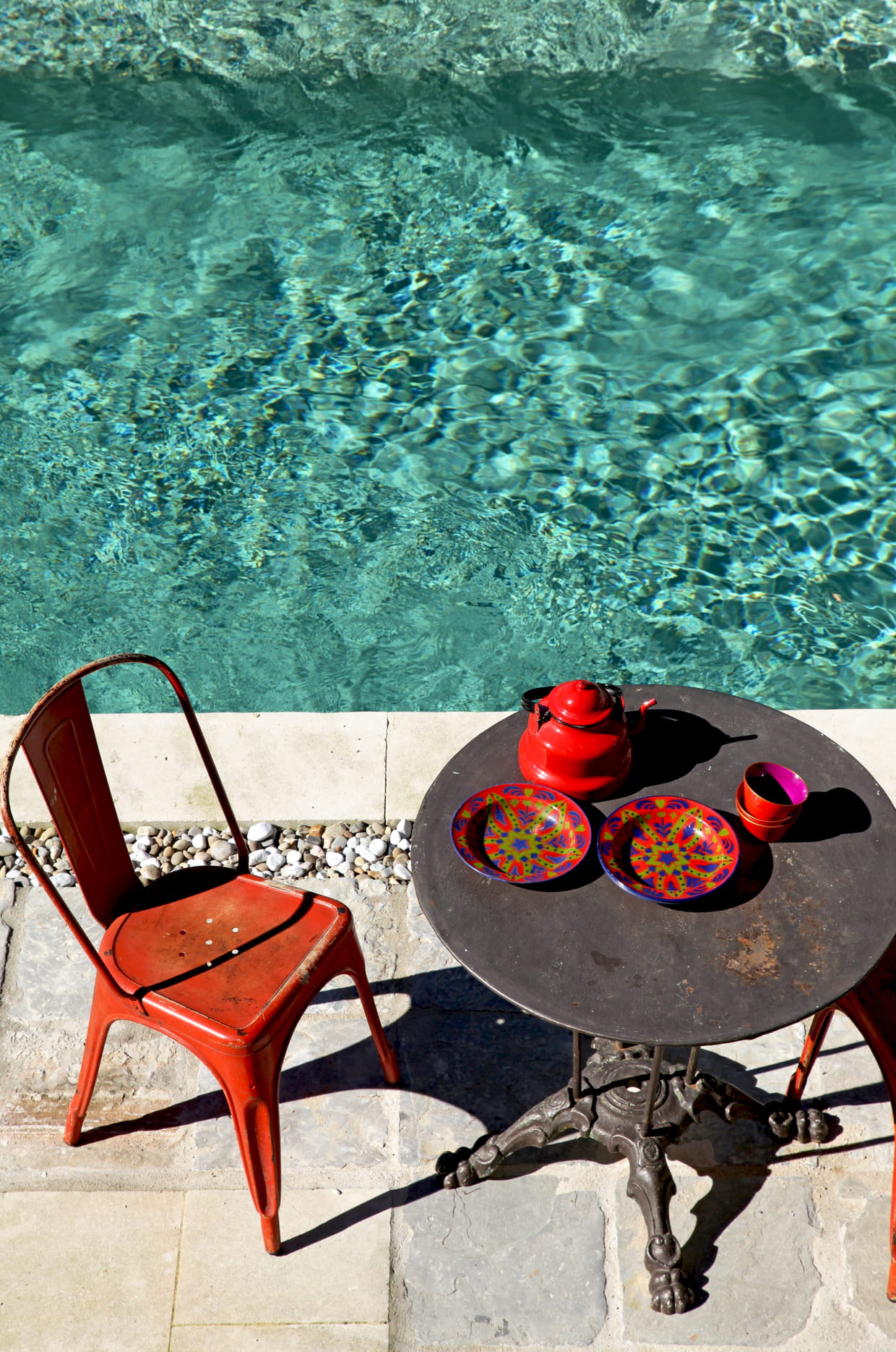 Aménagez-vous un petit salon de jardin au bord du bassin pour siroter une boisson rafraîchissante. Organisé autour d'une table et de chaises en acier, ce mobilier de jardin dynamise la déco extérieure en apportant de jolies notes de couleur.