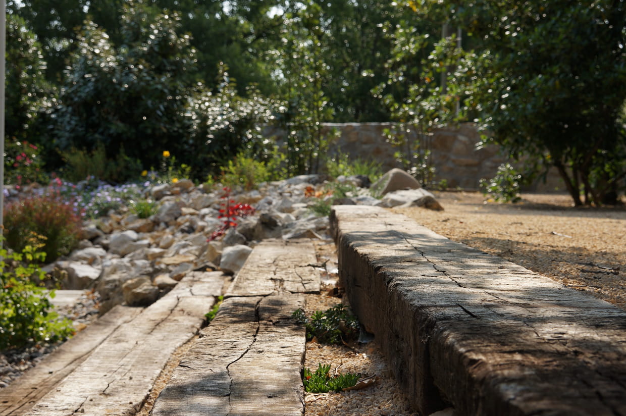 Un de souhaits de clients de Violette Egon était de réutiliser des traverses de chemin de fer qu'ils avaient récupérées. Ainsi, devant la terrasse, un escalier a été construit à partir de ces éléments en bois et de gravier grain de riz.