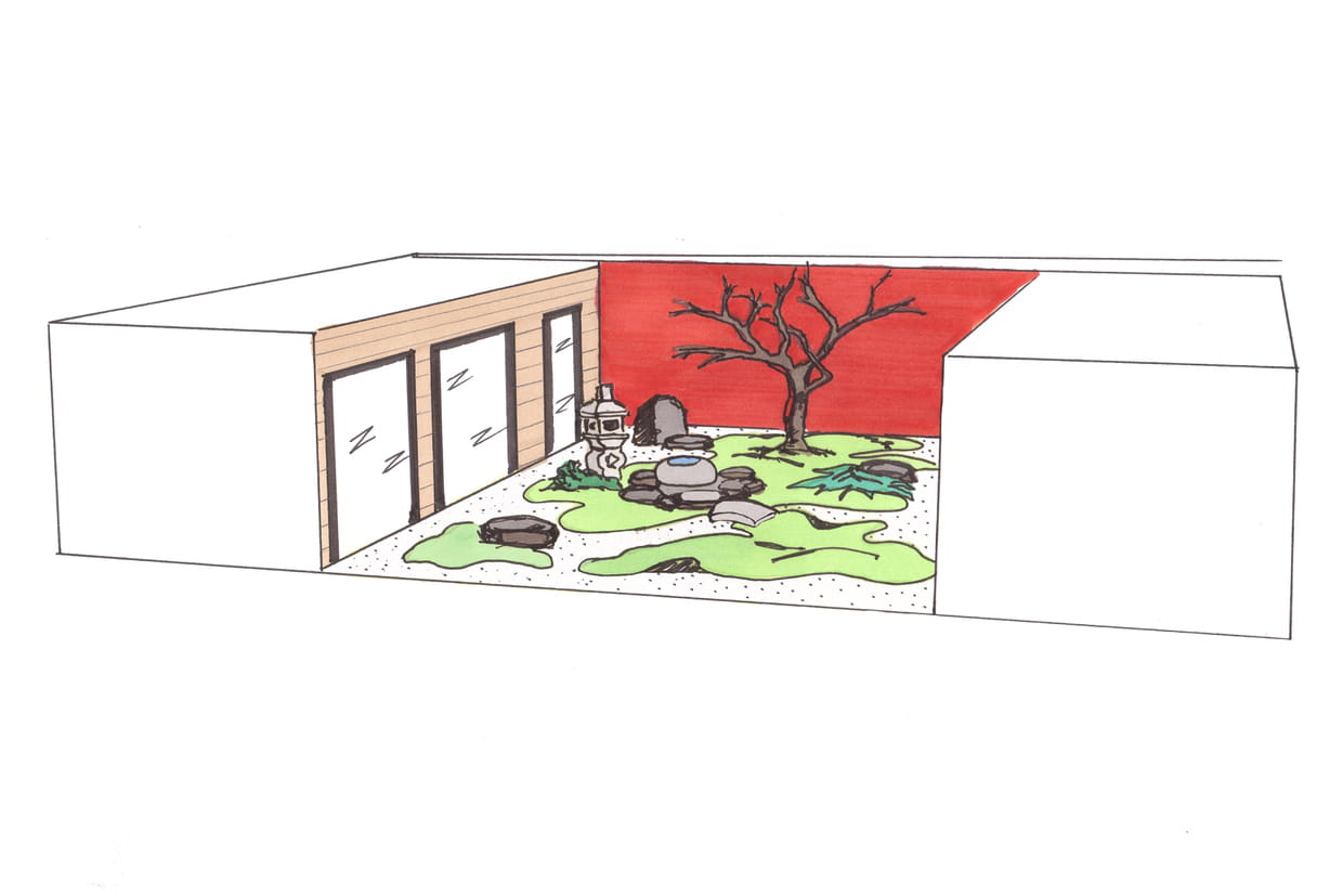 A ses clients désireux d'un jardin japonais apaisant, la paysagiste Sandrine Milic a proposé plusieurs aménagements de l'espace. C'est celui-ci, dont voici le plan en perspective dessiné au feutre à main levée, qui a été retenu.