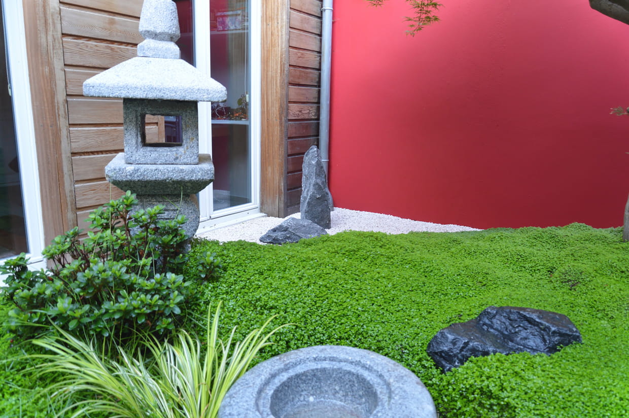 En ce qui concerne la décoration, on retrouve tous les codes d'un vrai jardin japonais. A commencer par la classique lanterne Oribe en granit dans laquelle on peut placer une bougie, à la cire ou à l'huile. A ses pieds, une azalée apporte une jolie floraison au printemps.