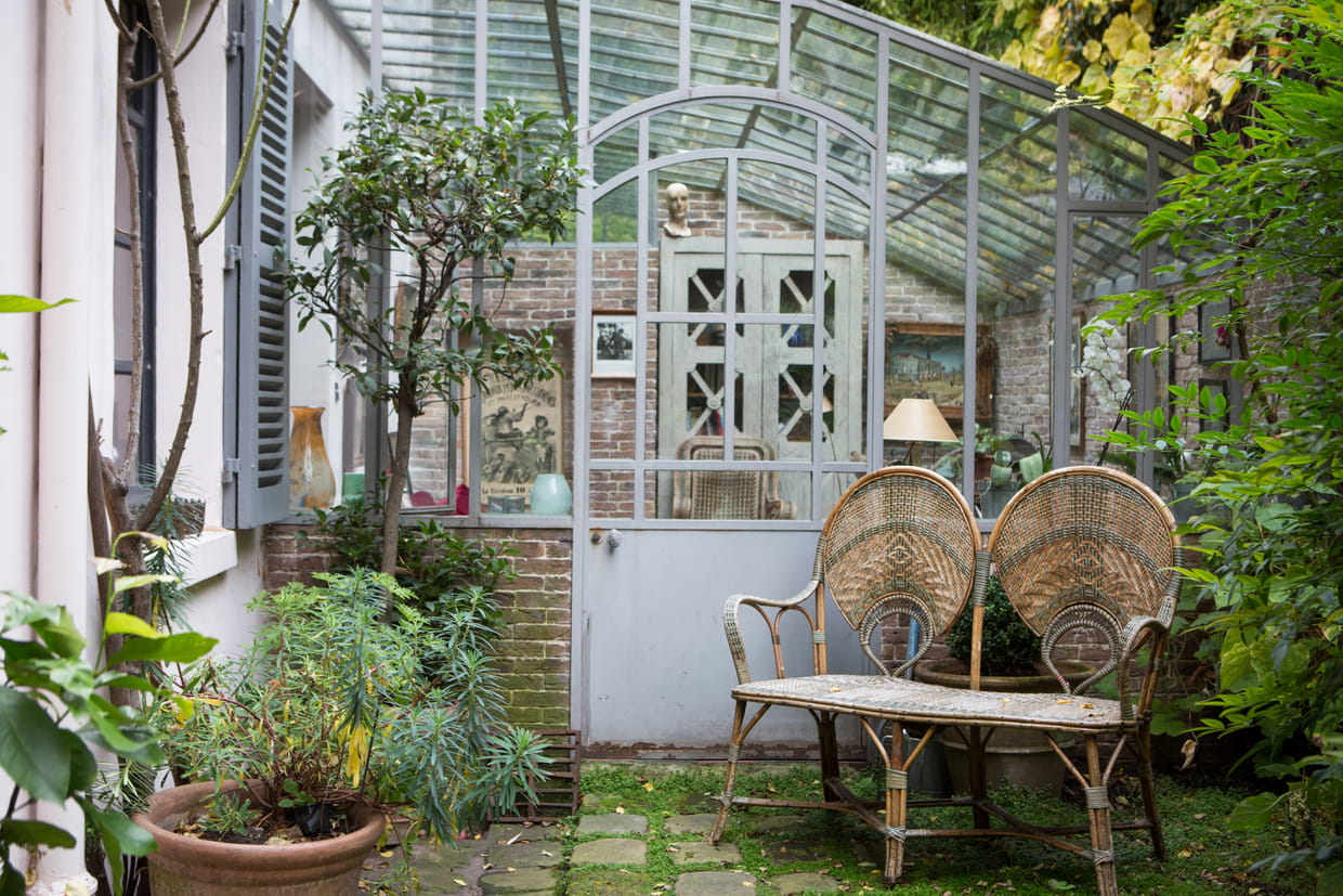 La nature a pris le dessus dans ce jardin. La végétation sauvage est volontairement laissée telle quelle. Une petite banquette en rotin vient légèrement décorer cet espace où l'on respire la verdure. Voir le reportage