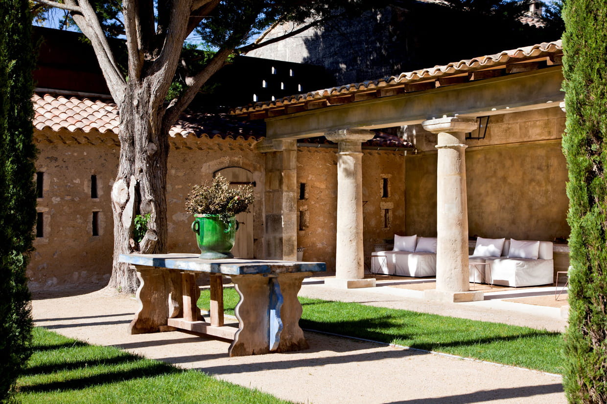 L'espace extérieur de cet ancien prieuré ne demandait que peu pour être du plus bel effet tant l'architecture du lieu et les beaux cyprès donnent le ton du décor. Les propriétaires ont ainsi seulement ajouté des canapés au blanc immaculé pour respecter l'esprit serein de l'ensemble.