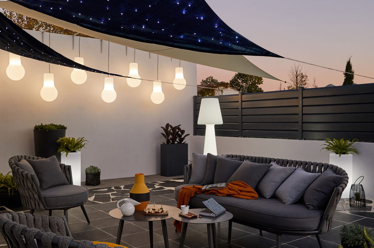 Avec les journées qui raccourcissent, la nuit tombera beaucoup plus vite sur vos dîners. Pour que la soirée continue confortablement, on mise sur un éclairage suffisant en adoptant lampadaires, lampes à suspendre ou même une voile d'ombrage avec des leds façon ciel étoilé.