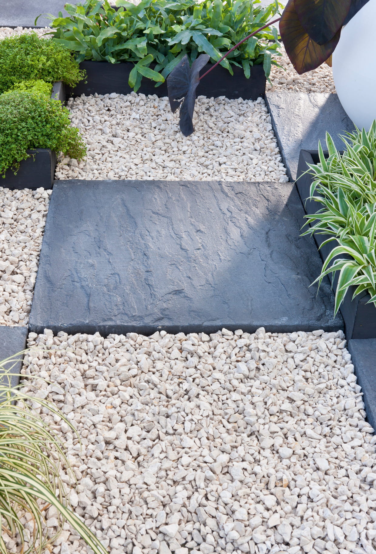 Semblable à un damier noir et blanc, cette allée conjugue des dalles en ardoise à du gravier immaculé. A l'aide d'une pose pour le moins originale, c'est un élégant chemin qui a pris vie.