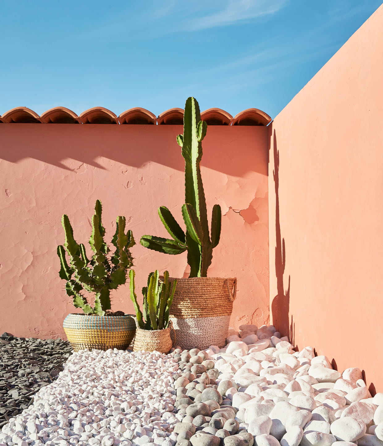 Galets et graviers font bon ménage dans cette cour ensoleillée. Blancs et gris clair à foncé, ils façonnent un joyeux pêle-mêle non loin des cactus et les murs, réchauffés de terracotta, renforcent l'atmosphère exotique, pour ne pas dire mexicaine, des lieux.