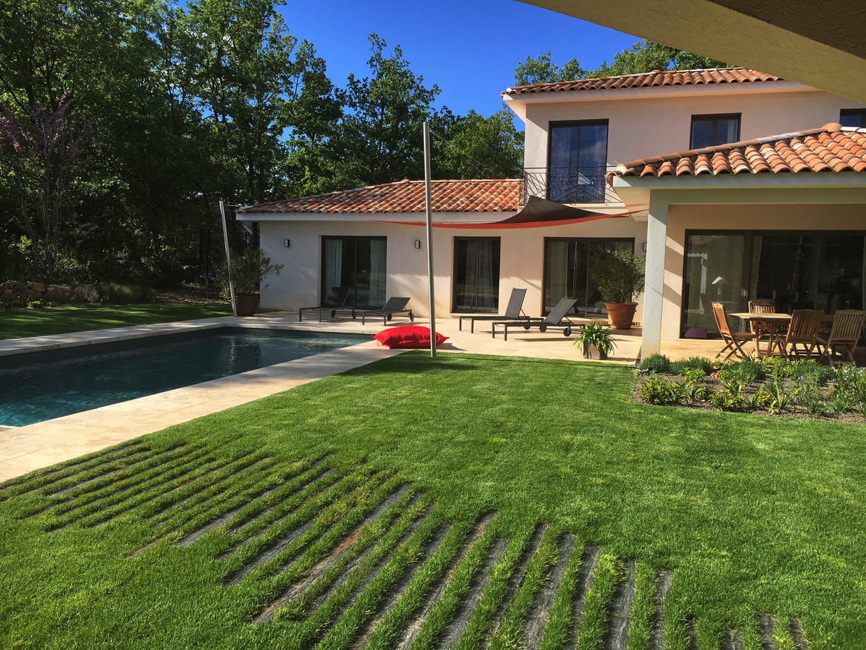 Si plusieurs espaces s'installent dans le vaste jardin, le paysagiste a pris soin de les faire communiquer de manière harmonieuse. La vaste pelouse accueille ainsi des pas japonais pour se déplacer jusqu'à la dépendance et au boulodrome.