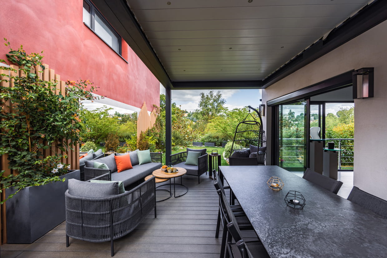 Mi-terrasse, mi-cuisine d'extérieur, le parti-pris a donc été de créer un véritable univers pours'y sentir bien. La cuisine de la maison étant située à l'autre bout de la maison, il a été astucieux de faire venir la cuisine (Eno manufacture) à la terrasse avec l'ajout d'une grande table de réception et la mise en place d'un barbecue de compétition. Plus de 70 m² de terrasse pour profiter de végétaux aux couleurs différentes à chaque saison de l'année, le tout dans un espace cocon avec vue dégagée s'il vous plait !
