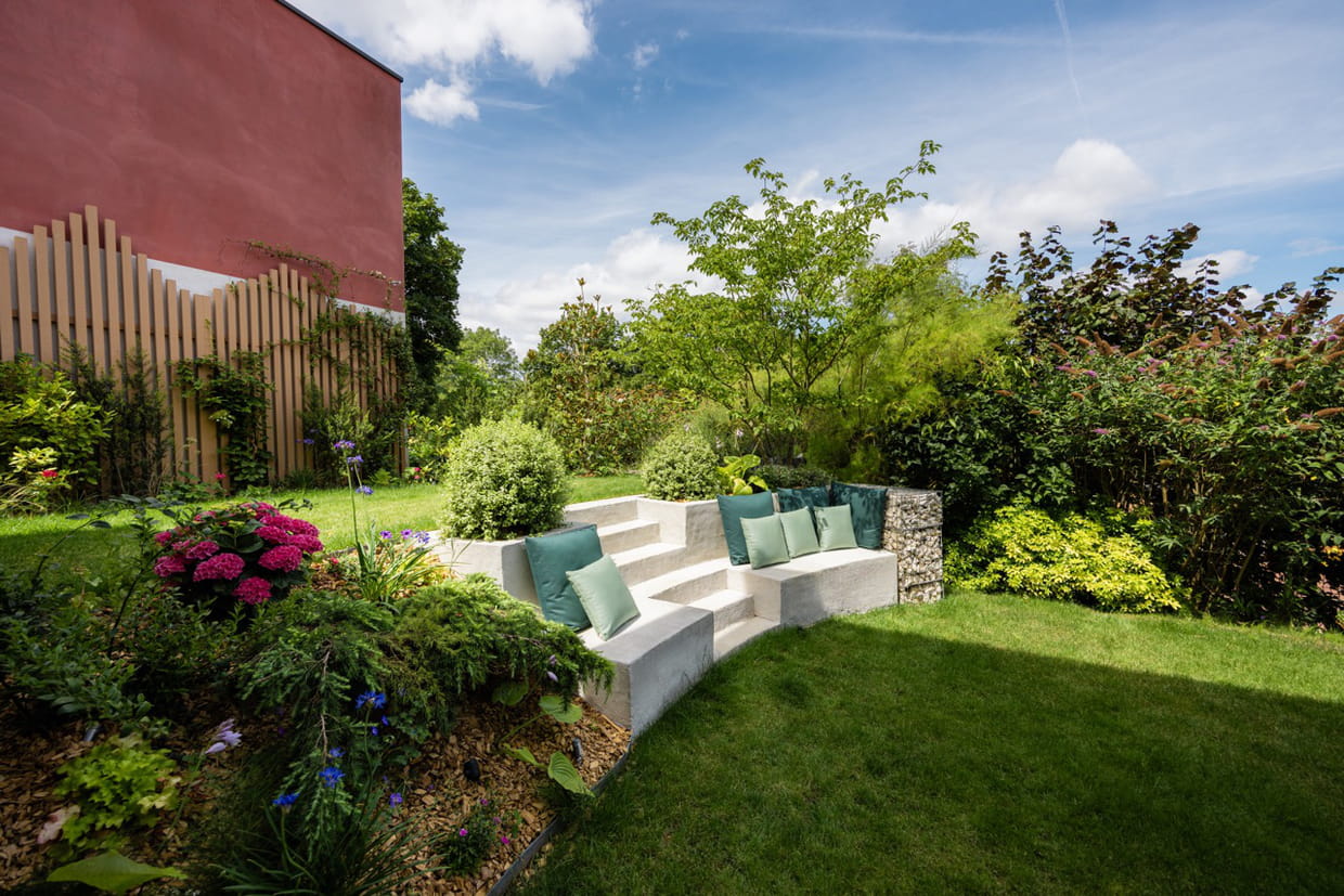 La prérogative numéro 1 des clients était limpide : retrouver un "vrai" terrain. Il a fallu donc réinventer l'espace en procédant à un nivellement du sol pour corriger la pente naturelle du terrain de façon à ce que le gazon et la terrasse soient au même niveau. Ce fut le gros du travail avec l'ajout de 15 m³ de terre en tenant compte des réseaux souterrains existants et la nécessité de remonter d'1,5 mètre. Autre point majeur de l'espace : un léger dénivelé a été gardé pour créer un amphithéâtre extérieur en béton lissé avec des murs en galbion, une véritable aire de jeux aussi moderne qu'originale pour les enfants du couple. Les coussins d'extérieur (Kettal) décorent le tout dans des verts de circonstance et restent dehors toute l'année grâce à leur matière en polyuréthane ultra-résistante.