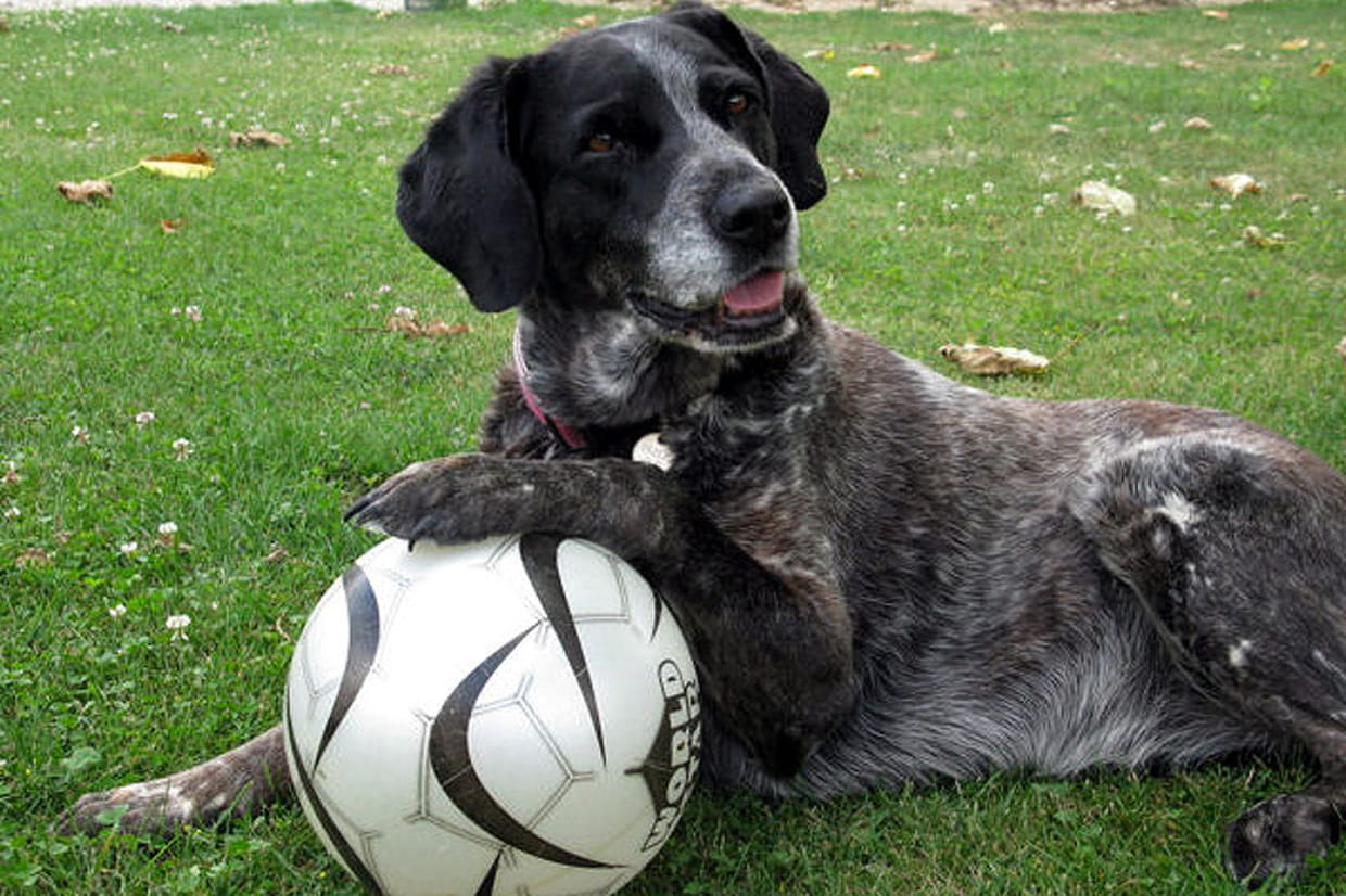 Peluche a du sang labrador, braque et épagneul dans les veines, ce qui lui vaut de nombreuses qualités. Avec sa patte posée sur le ballon et sa tête qui semble nous lancer un défi, elle est la preuve que les chiennes sont pleines de fougues !