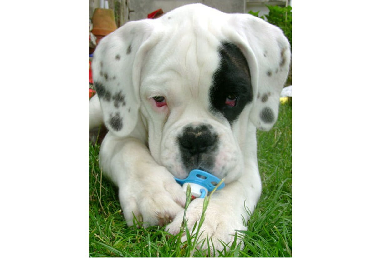 Découvrez les mimiques les plus farfelues des chiens des lecteurs. Un jeune boxer de couleur caille, cela est assez atypique ! Comment résister à cette petite bouille à l'air penaud et têtant sa sucette ?