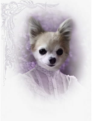 Ici, ce délicat portrait place une petite chienne dans le costume d'un personnage du début du XXe siècle.