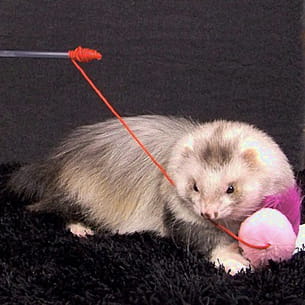 Les grelots suspendus à une canne à pêche sont typiquement des jouets pour chats... Désormais, il en existe également pour les furets. Ce NAC étant de plus en plus apprécié comme alternative aux chats et chiens, il dispose désormais d'un jouet adapté à sa taille.