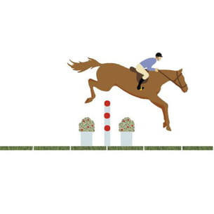En amorçant la descente, le cheval déplie les antérieurs et relève la tête, effectuant ainsi un mouvement de bascule qui le ralentit. Le cavalier, toujours en suspension,se prépare à la réception et garde les mollets au contact, talons vers le bas pour amortir le choc de la réception.