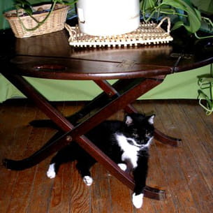 Navarre est un chat de gouttière qui à l'époque des faits avait 18 mois. A cet âge, il détestait rester seul, même avec le chien. Ce soir-là, lorsque Joëlle est rentrée, elle a constaté qu'il avait passé lui aussi une bonne soirée : ouverture de la porte du placard, descente du couffin à tricots, trouvaille du napperon en cours et surtout la pelote qu'il a déroulé autour des tables et le long du couloir : "C'est incroyable la quantité de coton dans une bobine !" se souvient Joëlle, dont la réaction ne s'est pas faite attendre : après un éclat de rire, elle a défait le tricot géant sous les yeux intéressés de Navarre, qui a tout de même eu droit à son gros câlin !