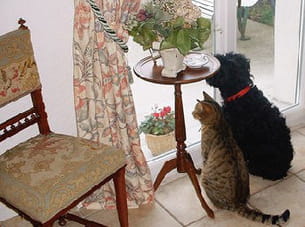 "J'ai Réglisse depuis bientôt six ans, et Cookies depuis quatre ans. Le premier contact s'est très bien déroulé car Réglisse a reniflé Cookies sans que celle-ci s'en préoccupe. Le moment le plus attendrissant, c'est quand ils font leur sieste sur le même petit divan. Le fait est que la chienne ne supporte pas le moindre geste malheureux du chat à notre égard. Dans ce cas, elle prend notre défense !" Corinne Lavenu