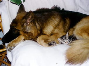 "Loustic avait 5 ans quand Pirate est arrivé. Cela a été difficile pendant les deux premiers jours, le temps que chacun découvre l'autre. Puis ils ne se sont plus quittés. Notre chat a malheureusement disparu, et Loustic a été très triste, au point de ne plus manger. Il a depuis fait connaissance avec Réglisse, un nouveau petit chaton, mais la confiance s'installe peu à peu !" Catherine Berdal