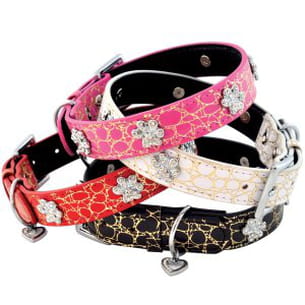 Avec ce très joli collier synthétique aspect cuir verni, votre adorable compagnon à quatre pattes sera des plus élégants pour sortir en balade. Les motifs aux fils dorés, les décorations pattes en strass et les petits pendentifs en forme de coeur lui donne un côté glamour qui n'est pas pour nous déplaire. Ce collier existe en 4 tailles. Pour les plus fashion d'entre vous, sachez qu'il y a également la laisse qui va avec.