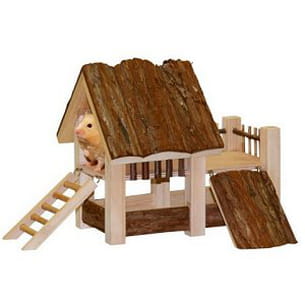 Voilà une aire de jeu qui séduira hamsters, souris, gerbilles, rats... Composée d'une maisonnette, d'une terrasse, d'une échelle et d'une rampe, elle est fabriquée en bois de pin. Elle fera le bonheur de votre rongeur qui  aura plaisir à venir jouer, se reposer ou dormir.