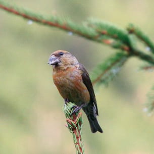 Le Bec-croisé des sapins est un bel oiseau, plus grand qu'un moineau, qui a la particularité d'avoir des mandibules qui se croisent d'où son nom. Cela lui est bien pratique pour décortiquer les cônes de pins. Il vit dans les forêts de conifères, en général dans les zones montagneuses. Des rencontres restent possibles si vous habitez à proximité de ces arbres.