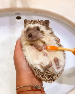 A titre professionnel, je me suis quand même renseignée et savez-vous que oui bien sûr, il est permis de baigner son hérisson, si on le fait avec douceur et attention. Déjà, installez-vous bien, de préférence dans une pièce chaude pour éviter qu'il ne prenne froid. Commencez par remplir une petite bassine (ou votre lavabo) d'eau tiède, en veillant à ce qu'elle ne soit ni trop chaude ni trop froide. Utilisez un shampooing doux, comme un shampooing à l'avoine, qui est apaisant pour la peau délicate des hérissons. Introduisez doucement votre hérisson dans l'eau, en évitant de mouiller sa tête. Avec une brosse à dents souple, frottez délicatement pour éliminer la saleté de ses piquants et de ses pattes. D'autres propriétaires de hérissons investissent dans une sorte de petite brosse à doigt, ou bien le font directement avec le bout de leurs doigts. Après le bain, enveloppez-le dans une serviette douce pour le sécher.