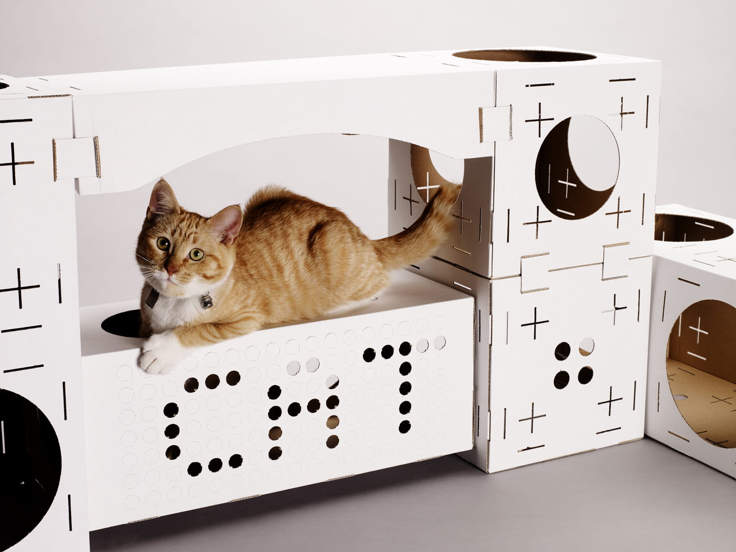 Deux tours, deux cubes, un tunnel, un pont, un toboggan et des fixations à assembler. Grâce à cet équipement, les chats jouissent d’un confort absolu pour se détendre ou s’amuser. Blocks a été entièrement fabriqué à partir de matériaux biodégradables, du carton essentiellement. Mais attention l’ensemble est super costaud. Et sa solidité a été éprouvée auprès "des chats les plus féroces", nous a-t-on précisé !