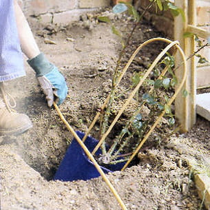 Déposez votre rosier (encore en pot) dans le trou et vérifiez la profondeur de la plantation.