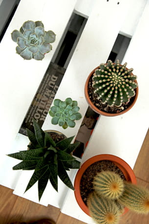 Pile dans la tendance déco récup', les palettes en bois, une fois détournées, s'invitent dans les intérieurs, quels qu'ils soient. Et avec elles, les mini cactus, pour une touche d'exotisme végétal. Dépaysement garanti !