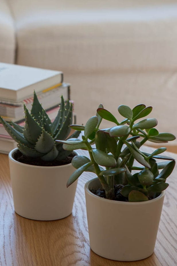 Ainsi disposées sur la table basse, Aloe et Crassula végétalisent la pièce de vie sans chichi.