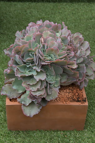 Dans la famille des Crassulacées, cette Echeveria d'origine japonaise ressemble à un chou avec ses rosettes variant du vert clair au printemps au rouge en hiver. Sa floraison se traduit par la poussée d'une hampe ramifiée de 30 cm environ avec une fleur rose foncé. Cette plante ne supporte pas trop le froid : on la laissera donc à l'intérieur en pot en hiver et on la sortira au soleil en été.