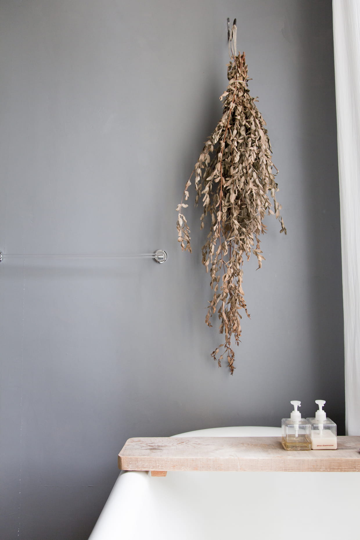Ainsi accroché au-dessus d'une baignoire sur pied, ce bouquet d'herbes sèches fait office de décoration murale pleine de charme. Visitez cette maison de campagne au charme fou