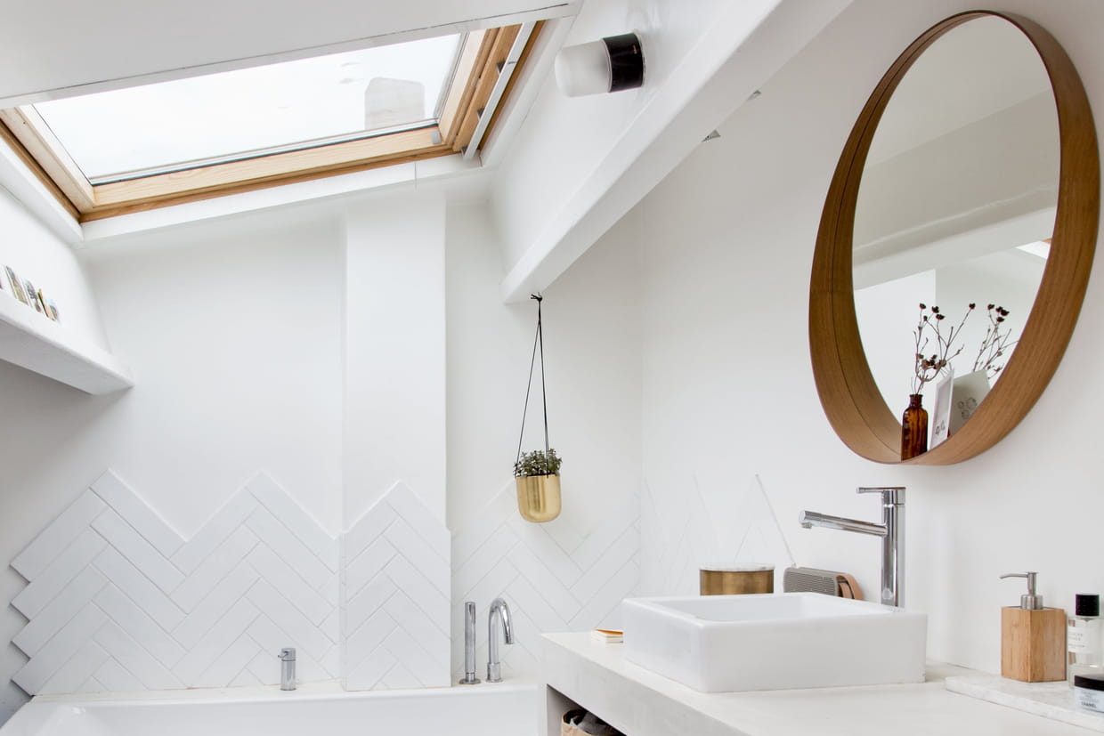 Délicatement posée sur le rebord du miroir de la salle de bains, cette tige de fleurs séchées en soliflore apporte une touche végétale bienvenue dans cet espace immaculé. Visitez l'appartement de la designer Margaux Keller